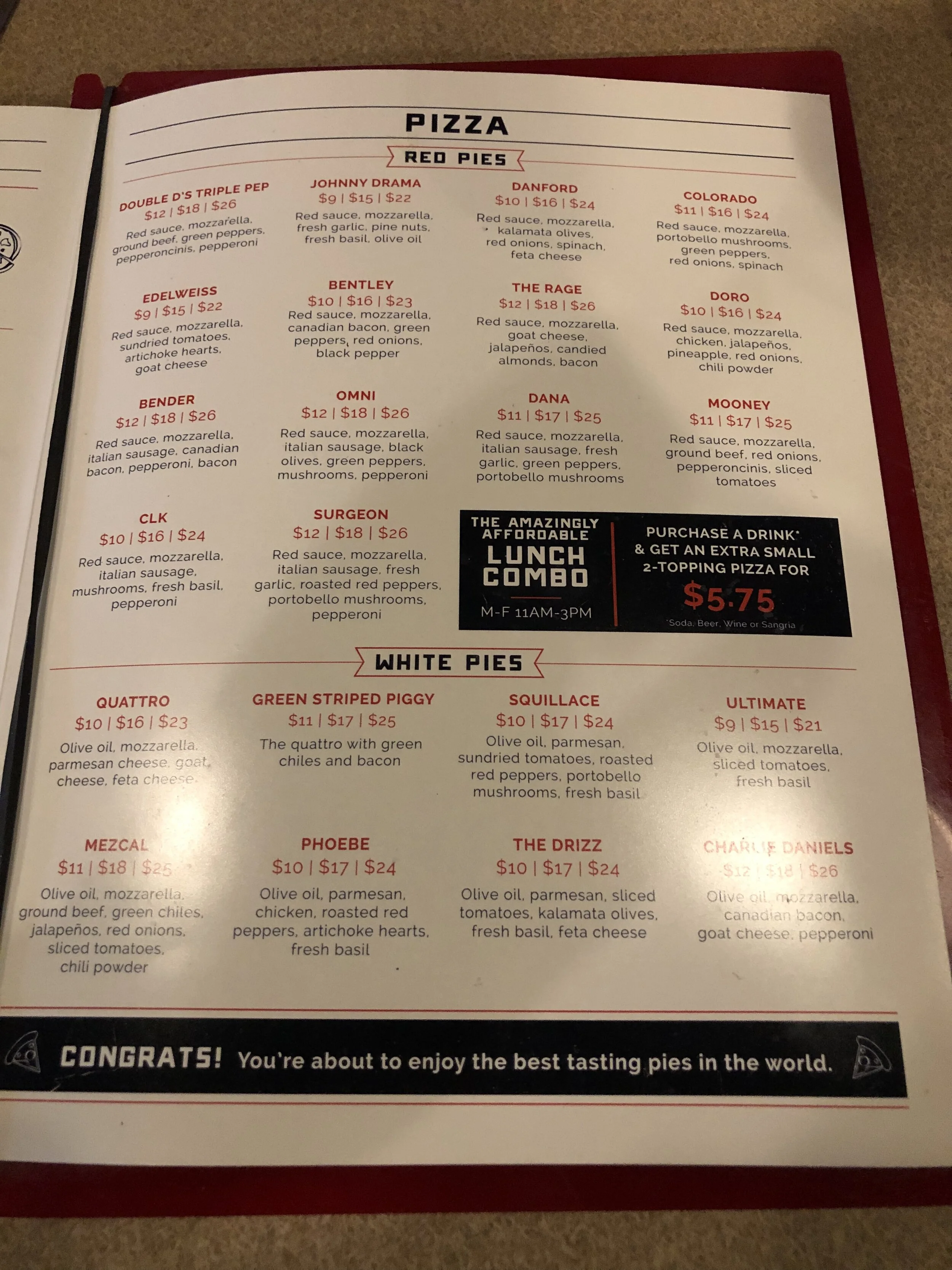 For a while there, we visited 575 at least twice per week. We tried all the pies, salads and beers. Our car almost knew its way to 575. We began to know the staff so well, we went to the wedding of two of the employees. We became friends with the owner and the managers. My wife had her own Local's Choice for a time. The HulaNoma was a blend of Pepperoni, Pineapple and Green Chiles. I cannot recommend it enough.